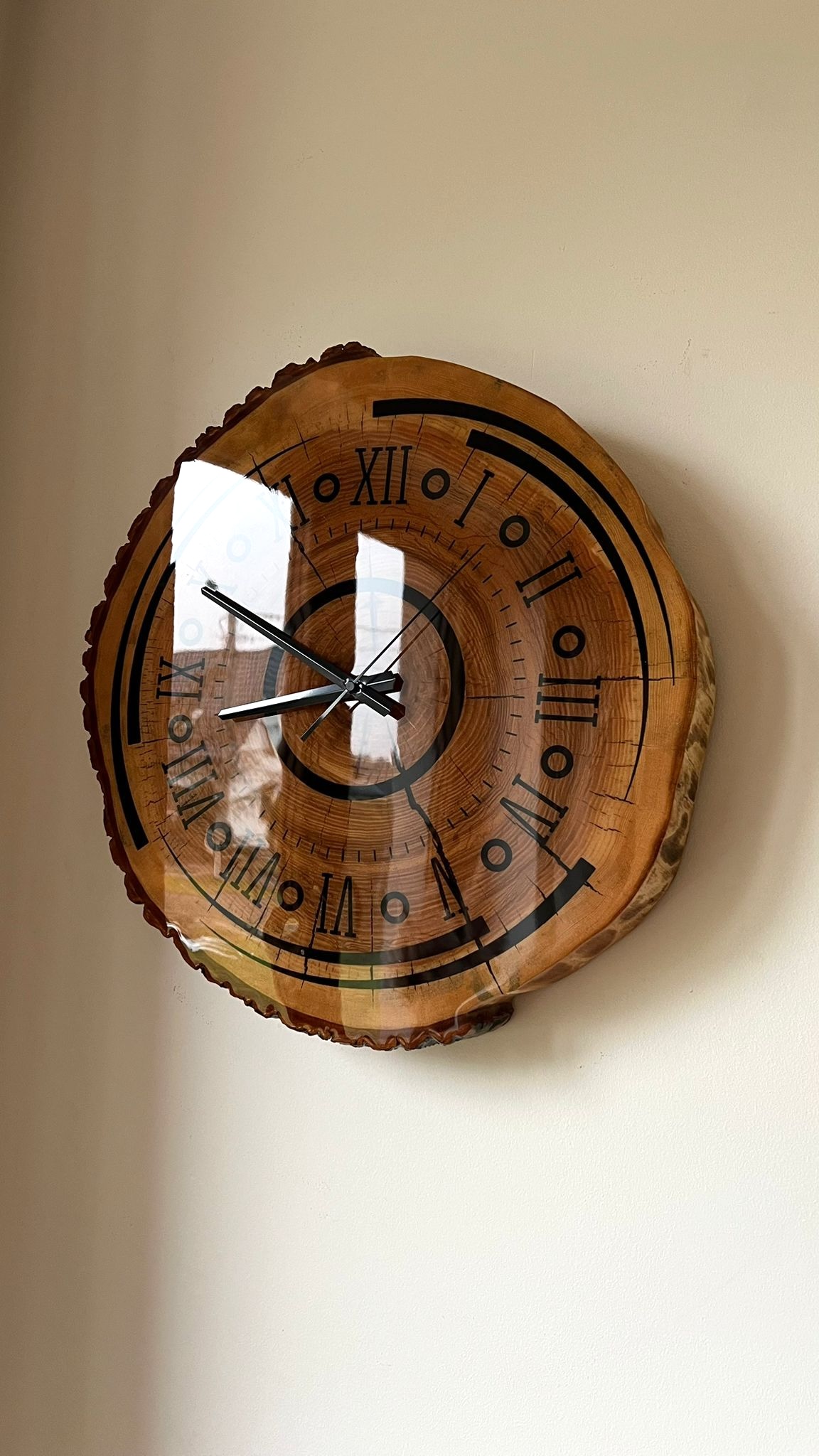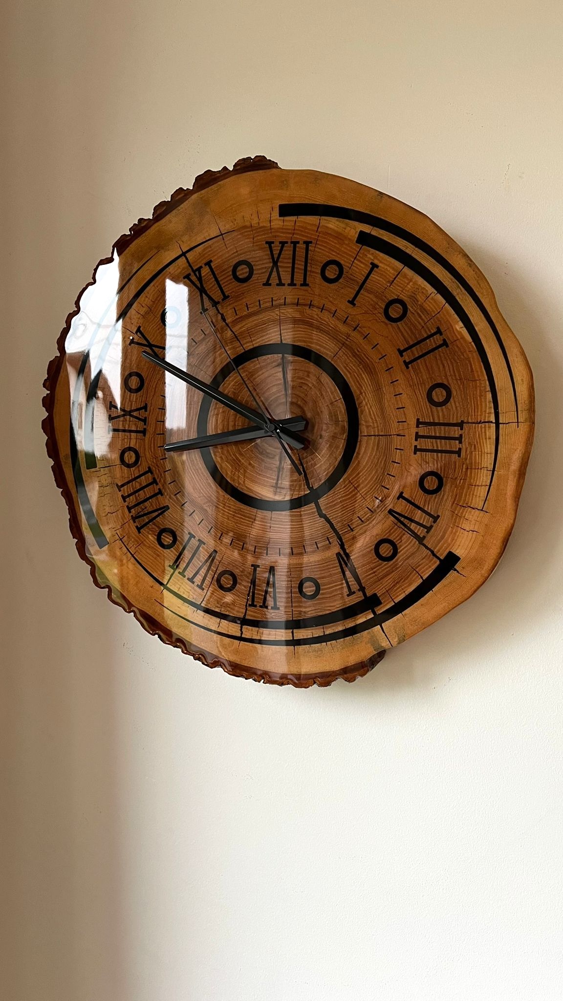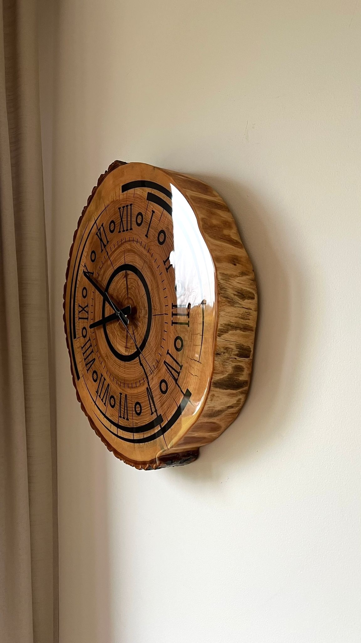 Unikatowy zegar ścienny wykonany z jednego, litego plastra naturalnego drewna, zachowującego oryginalny kształt i naturalną krawędź. Każdy egzemplarz jest absolutnie niepowtarzalny – rysunek słojów, pęknięcia i nieregularna linia obwodu tworzą autentyczny, rzemieślniczy charakter.